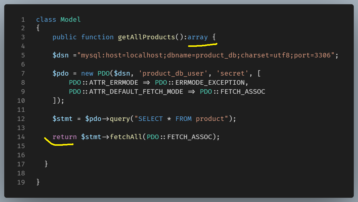 We take the code that gets the products from the database from the top of the index.php file, and then we paste it into the getAllProducts method.