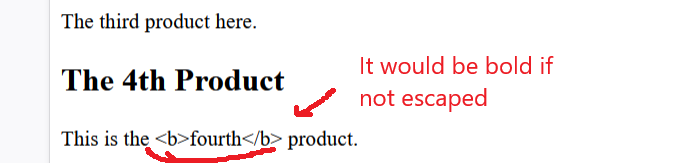 We see that the fourth listing contains some HTML code, and since it is escaped, the literal value is displayed instead of the code being interpreted by the browser ( the word fourth would be bold in that case).
