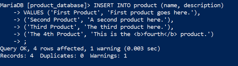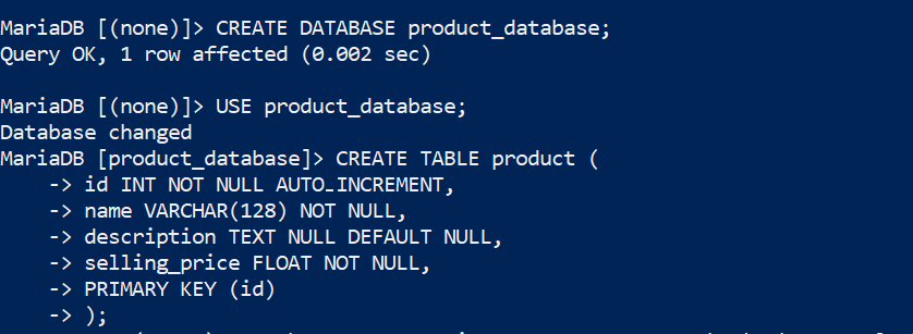 We begin by making a new database, which we’ll call product_database. Next, we will select that database and create a table called product.