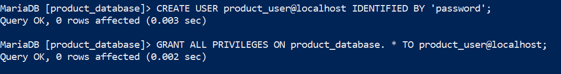 Then make a user for the database, label it product_user, and provide a password.