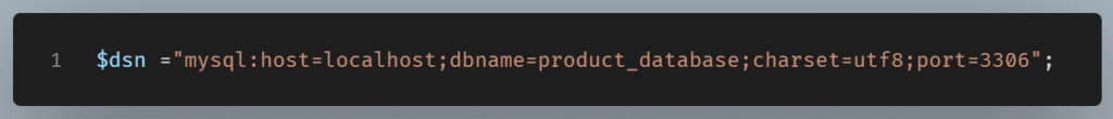 mysql:→ we’re using MySQL.host=localhost→ the database runs on a local machine.dbname=product_database→ the name of the database.charset=utf8→ use UTF-8 encoding (good for handling all kinds of text).port=3306→ the default MySQL port.