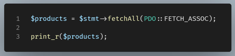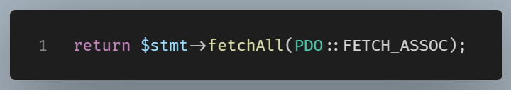We’ll use the fetch all method on this statement object, using the constant to retrieve the data as an associative array.