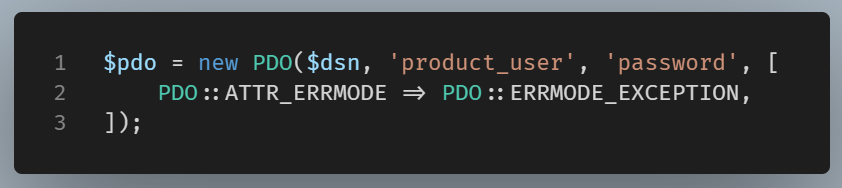 Then we create a new object passing in the $dsn variable, the username, and the password we have already created. We also set up PDO to throw exceptions on errors.