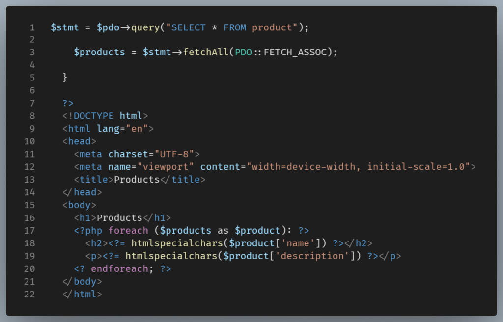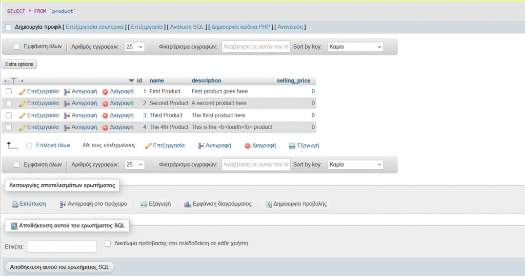 After that, some PHP will loop through the products, showing the name and description columns of each record.
