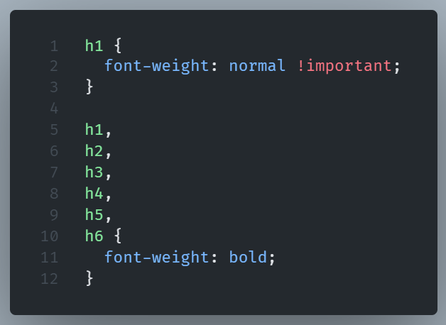 In our previous example, applying the !important label changes the order of importance and, as a result, the style of the heading.