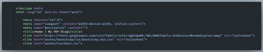 In the example, we have placed our custom stylesheet ‘main.css‘ after the bootstrap and google fonts stylesheets.