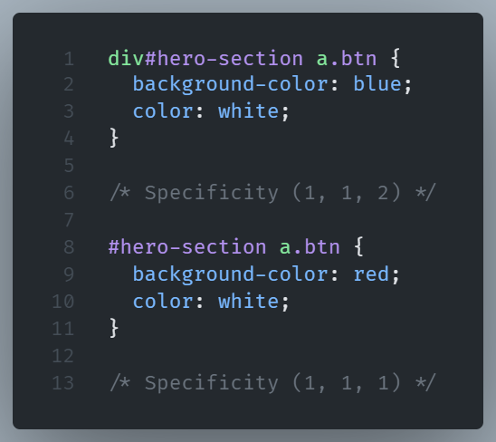 NOTE: It is considered best practice to rely more on specificity rather than on the order of appearance. In the case of rearranging our code in the future, we won't mess up our styles.