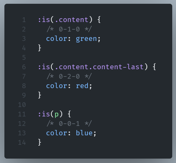 The :is(), :has(), and :not() pseudo-classes don’t add any specificity weight, making them an exception to this rule.
