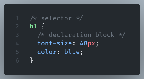 Here h1 is the selector. In the declaration block, inside the curly braces, we define the styles of the HTML element ( font-size and color in our example).