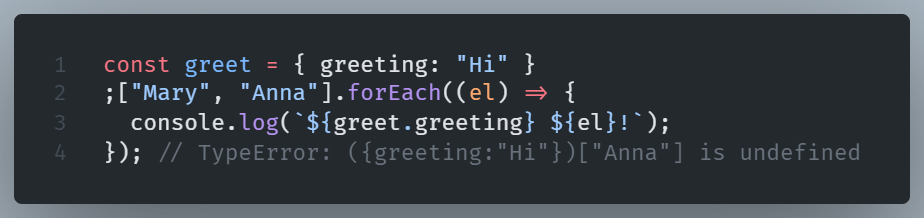 If you prefer not to use semicolons, when starting a line with parenthesis, place a semicolon in front of them in order to avoid concatenated with previous line’s code.