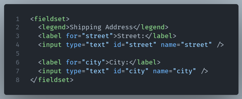 <legend> goes inside the <fieldset> and acts as a title for that group. It’s the label for the entire section. So instead of writing a header above the inputs, you use <legend> and let it semantically describe the group. Here’s a quick example: