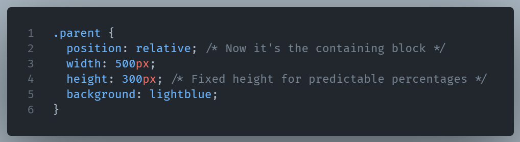 If we want .child’s percentages to be relative to .parent, we need to explicitly position .parent: