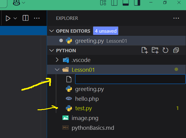 Then we click the file icon and an input is opened. We can name the file there and define its type. Let’s create the file test.py.
