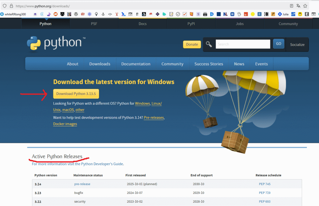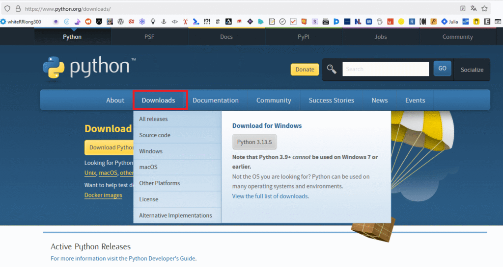 Hovering the Downloads tab, will open a window with options to download Python in macOS and other platforms.