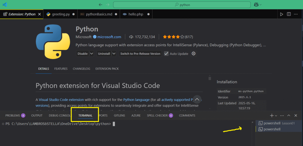 We can have multiple terminals working simultaneously. You notice my terminal is named powershell. This is because PowerShell is my default terminal. If yours is Bash or cmd it will be named after that.