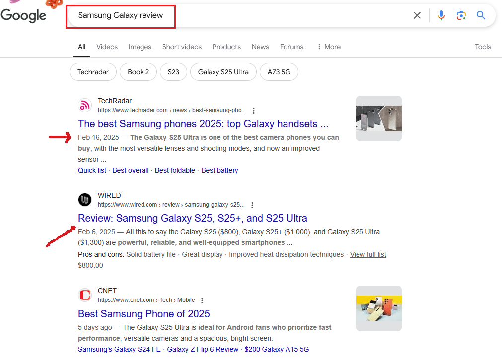Regarding queries like “Samsung Galaxy review” or “Is Frankfurt stock market open now?” Google considers freshness to be an important factor.
