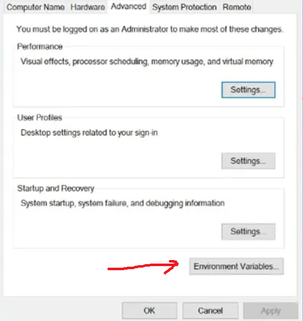4. To access Environment Variables, navigate to the System Properties window’s Advanced tab and click the button at the bottom.
