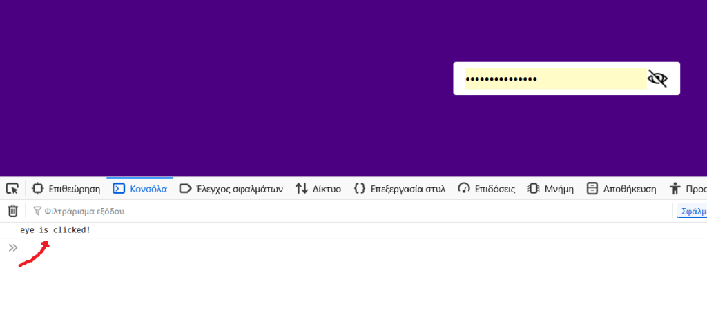 If the password is hidden (type=’password’) it makes it visible (type=’text’), and vice versa.