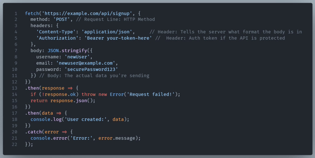 JavaScript, using the modern fetch API for HTTP requests is a very common way in web applications for registering a new user via an API.