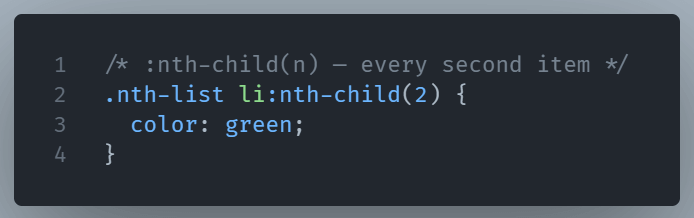 :nth-child(n)– Targets specific items in a list or grid based on order.