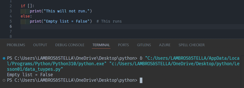 - Falsy: 0, 0.0, “” (empty string), [] (empty list), {} (empty dict), None