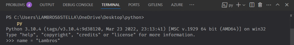 I typed name equals and after I did that I assigned the value ‘Lambros‘ to the name variable.