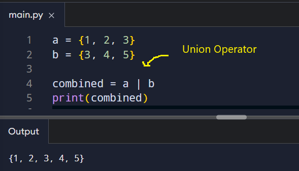 The union operator (|) merges all unique items from both sets.