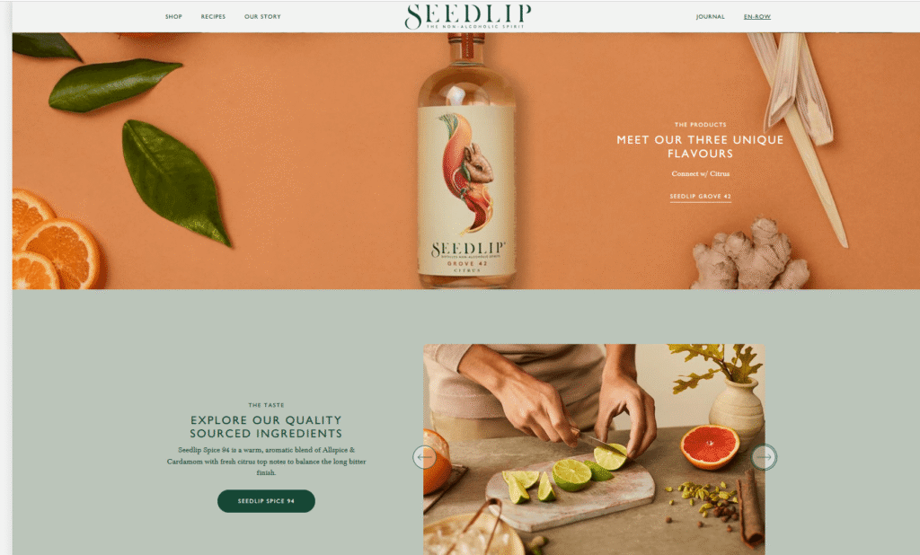 Seedlip’s clear and concise messaging is effectively communicated through whitespace and a single line of text.