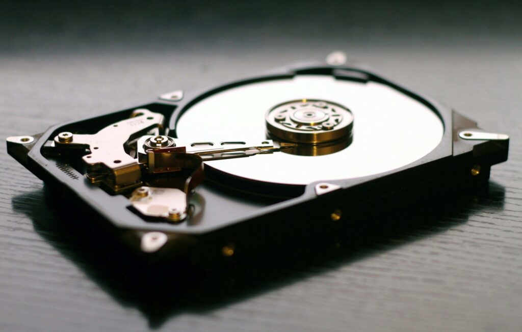 It has a spinning platter and an arm. The platter stores the data; the arm accesses it for reading and writing.
